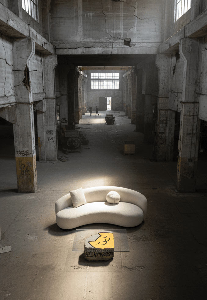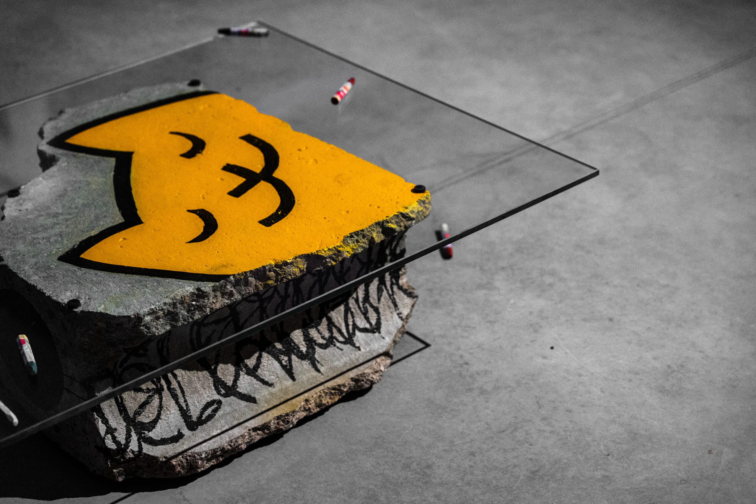 A rough concrete block is the equivalent of the modern Sisyphus stone. Here the stone becomes a symbolic form of the burden of life, a metaphor for the creative process, efforts and perseverance, and at the same time – a uniquely human object on which the cat… rests.
