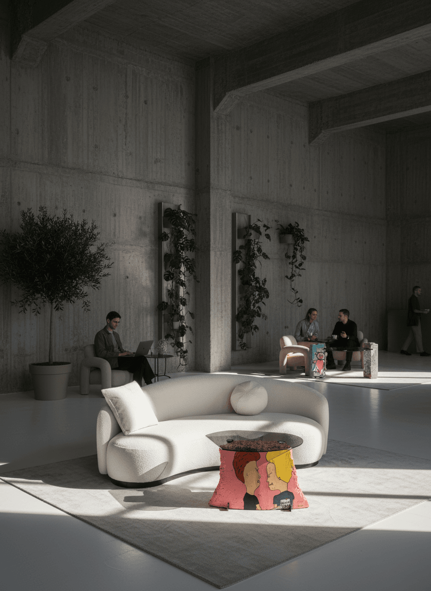 This object combines what is “found” with what is consciously “created”. It is not just a piece of furniture – it is an emotional capsule that contains nostalgia, irony and layers of urban culture in one concrete piece.