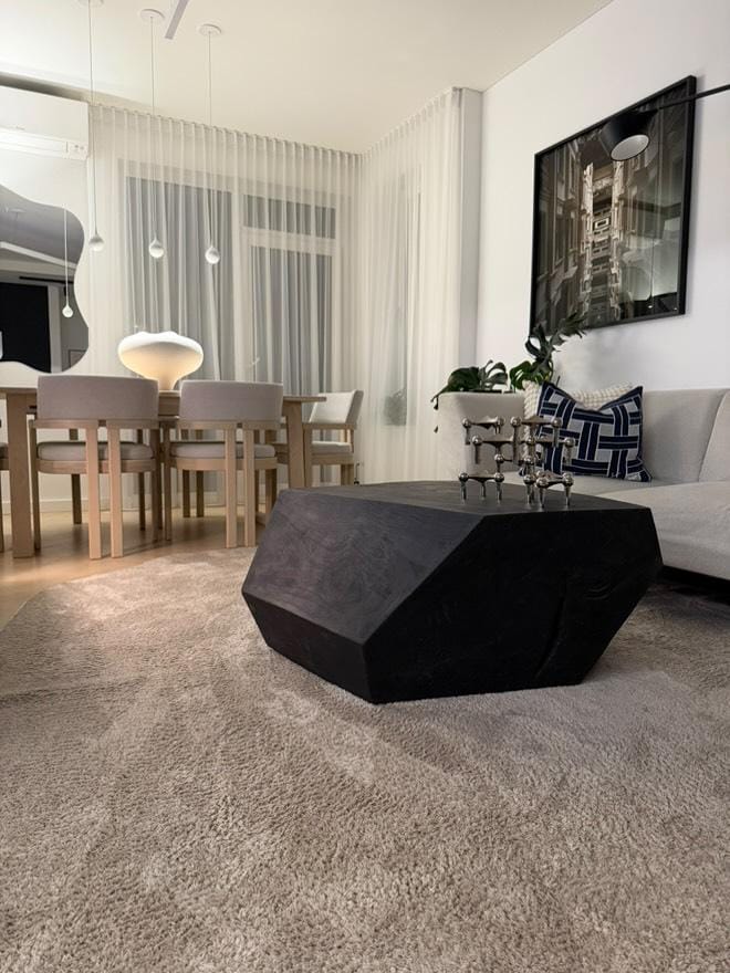 The design of this coffee table was crafted in a unique way by removing tree rot from the wood. Its striking black color was achieved through a process of wood burning, a technique that enhances the natural beauty of the wood. This handcrafted table is not just a piece of modern furniture; it’s an abstract art piece that combines the elements of nature-inspired design with sustainable craftsmanship. The forms were shaped by nature itself, creating a truly one-of-a-kind furniture piece perfect for contemporary living spaces.