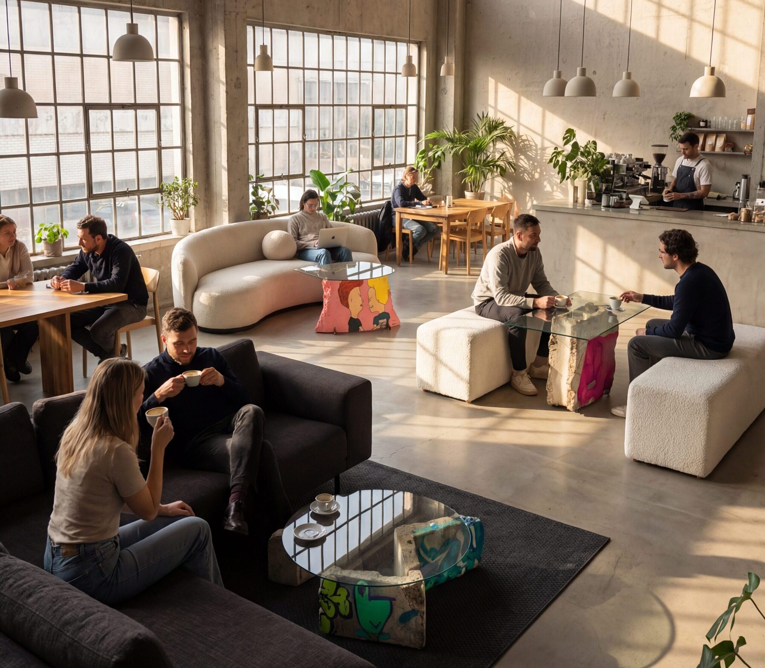 The visitor sits down not at an ordinary piece of serial furniture, but at an object with weight and cultural expression. This creates an experience – the authenticity of the material, the proximity of imperfection. The result? A longer stay and a completely different scenario than in typical “fast” cafes.