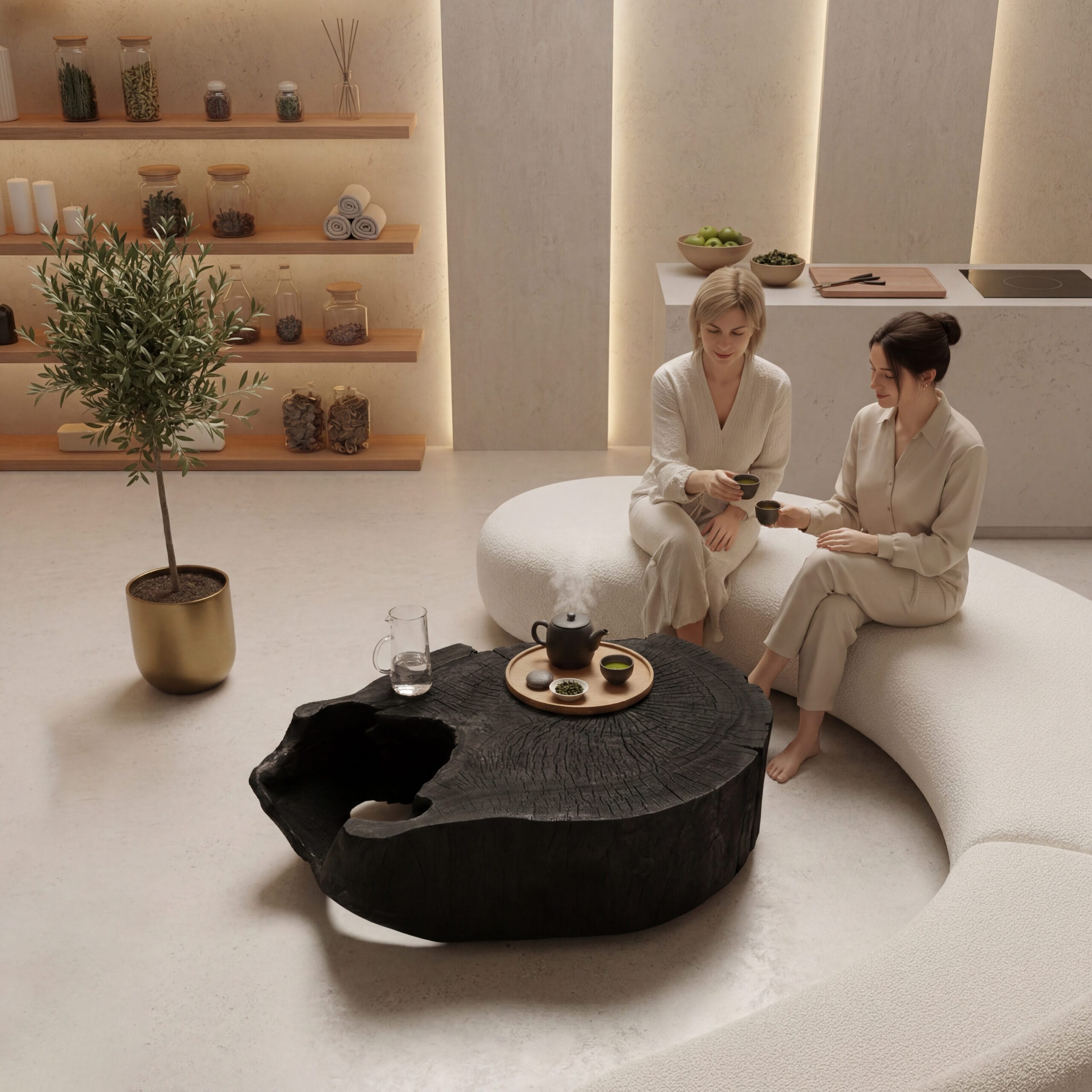 In this clinic, the tables are not just interior details – they themselves participate in the healing process. When we enter the clinic and see a table with a natural wood split or uneven edge, our insides instantly calm down. Our brains don’t have to “decode” foreign, sharp or artificial shapes, so they “breathe”.
