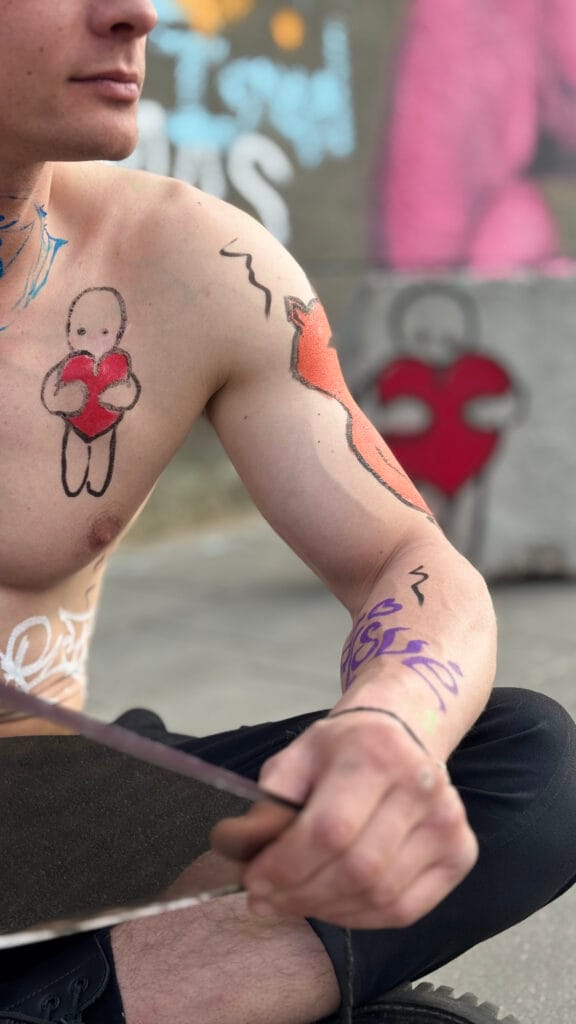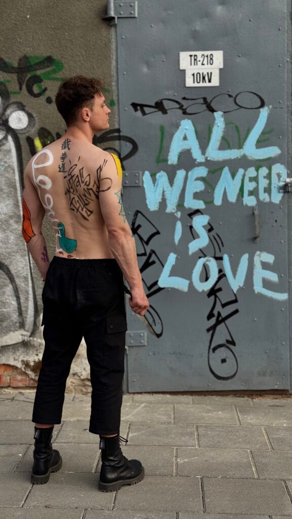 Tai nebuvo atsitiktinis estetikos gestas. Nusprendžiau išsipaišyti grafičių ženklus, kurie buvo ir ant parodos objektų, nes norėjau parodyti, kad nuo to nesiskiriu. Tie ženklai – tai miesto kalba, tikri Kauno paviršiai, perkelti į kūrinius, o galiausiai – į kūną.