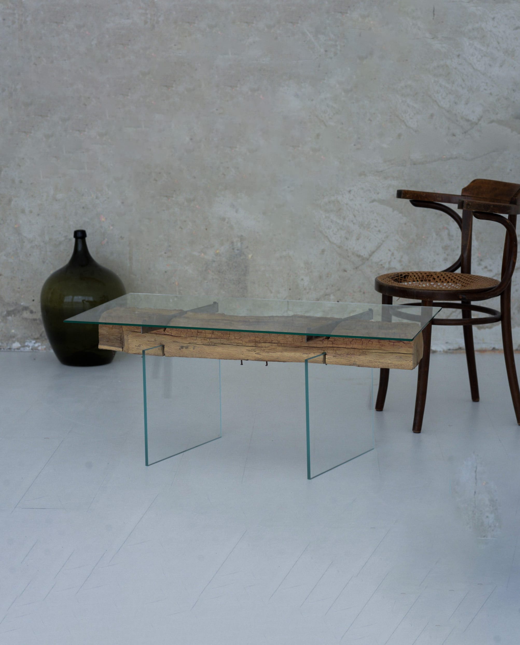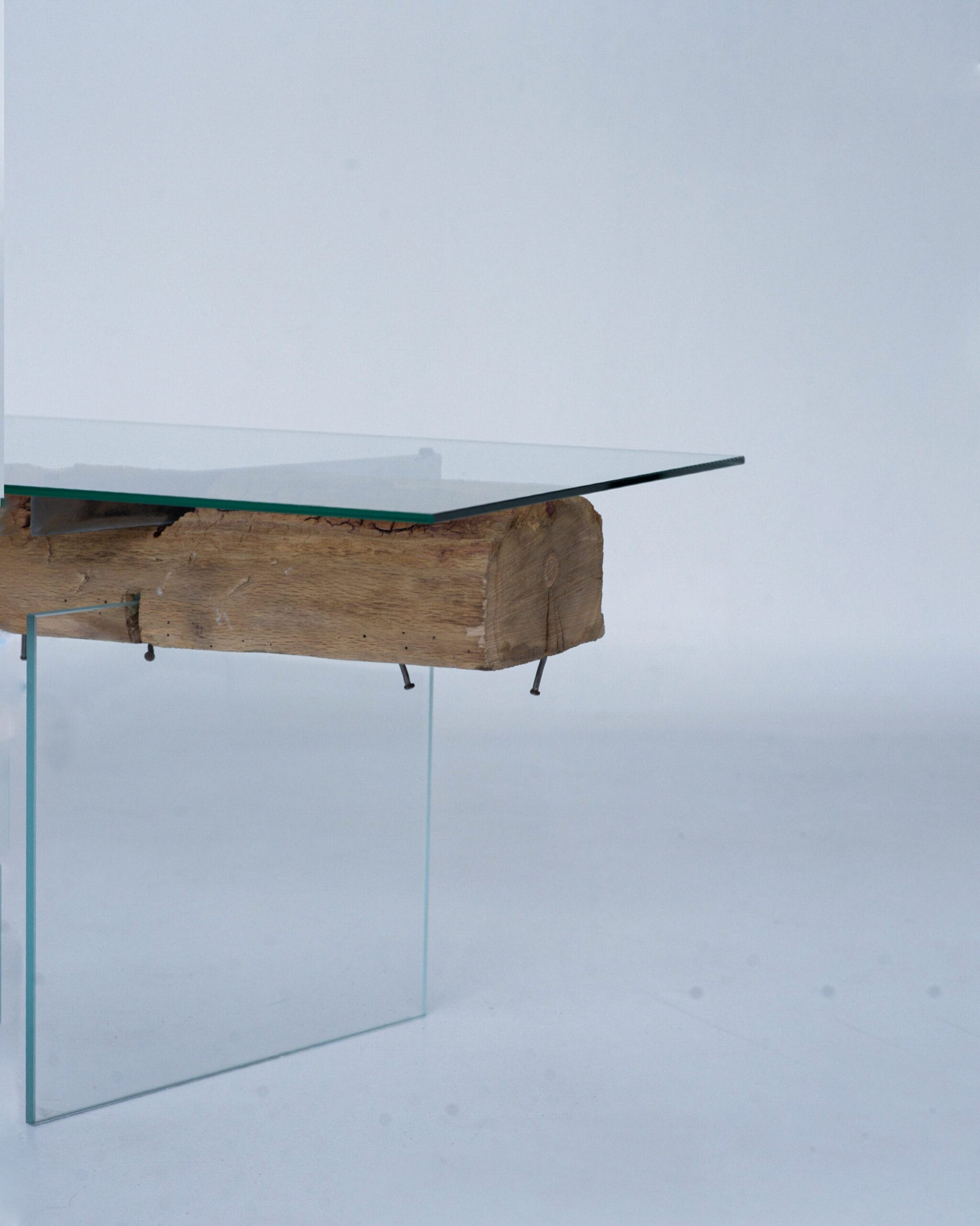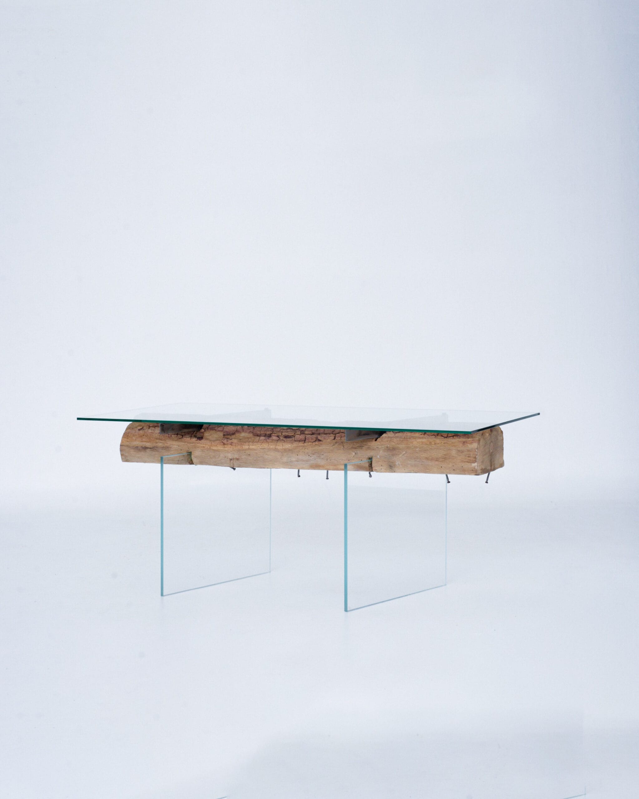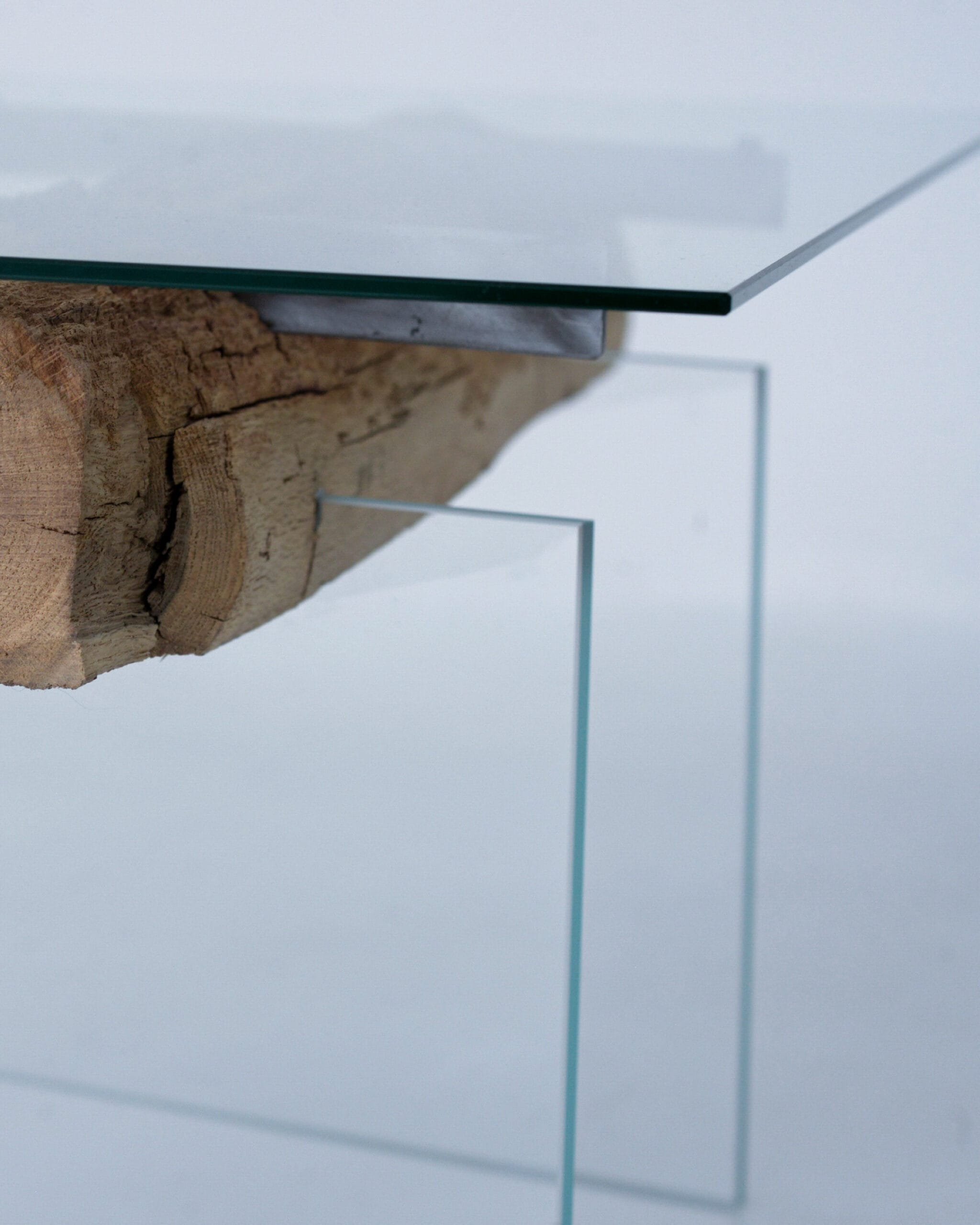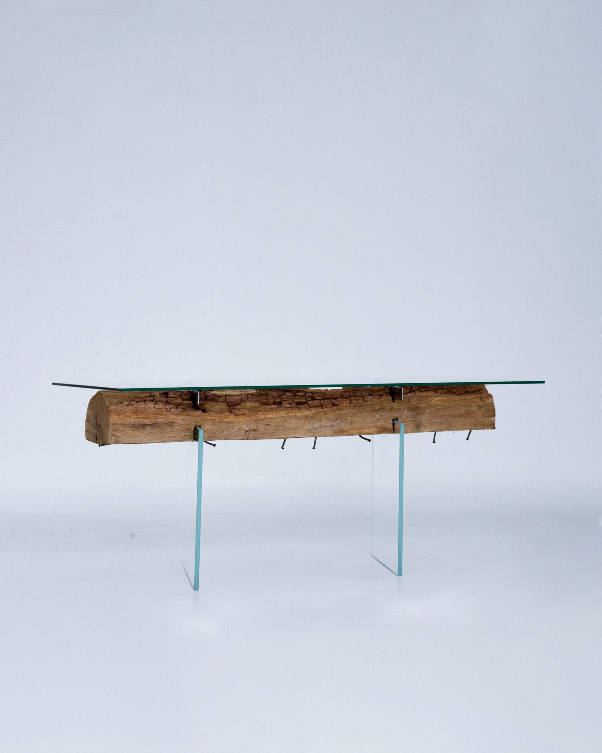 Viršų dengia skaidraus stiklo plokštė, kuri leidžia matyti visą medžio paviršių, tarsi sustabdytą laiką. Dvi stiklinės atramos, šiek tiek pakreiptos, sukuria kontrastą – tarp seno ir naujo, gamtos ir žmogaus, stabilumo ir trapumo.