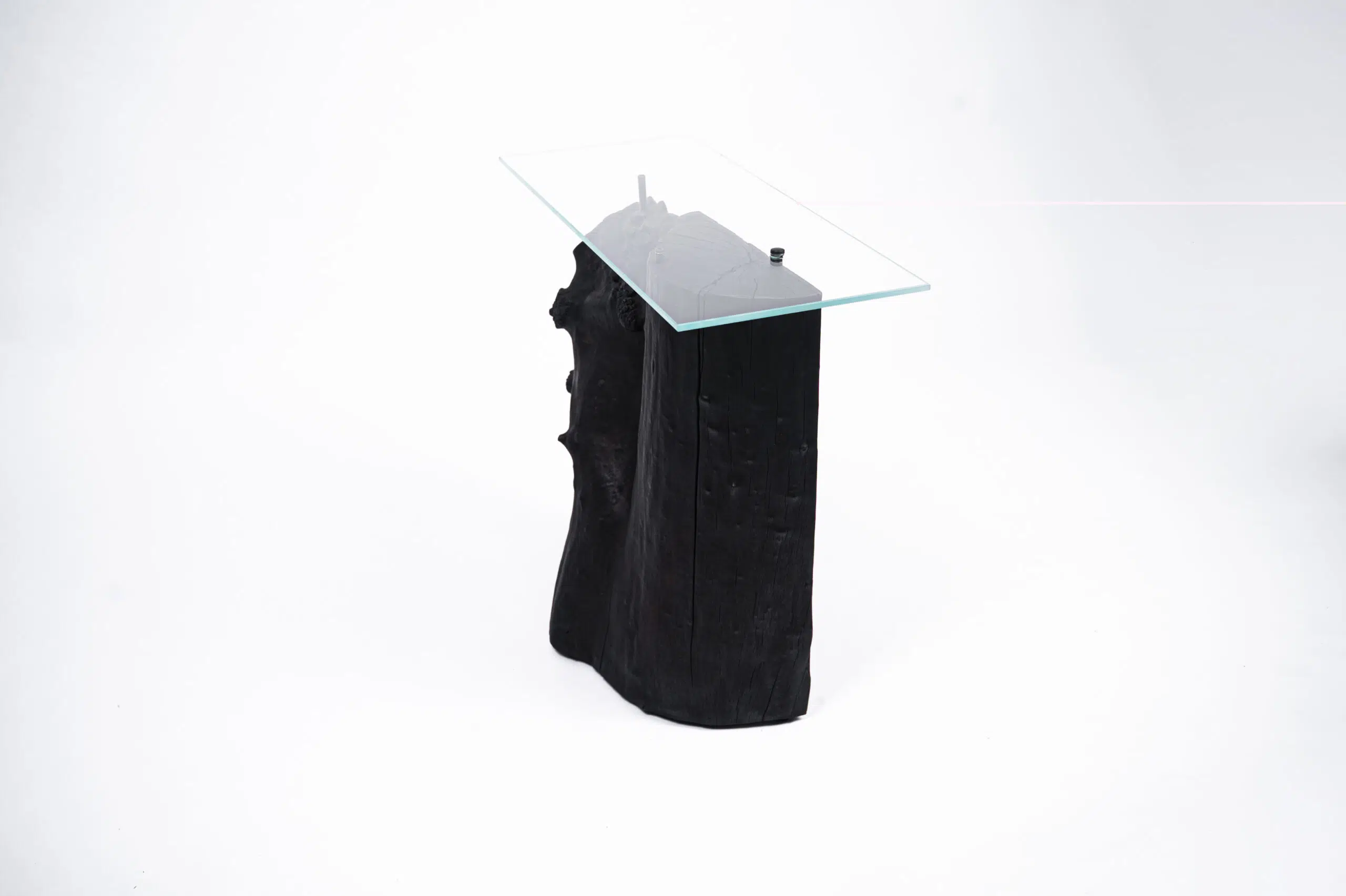 Viršuje esantis stiklas įneša tvarkos ir lengvumo – jis kontrastuoja su sunkiu, laukiniu medžio kūnu.