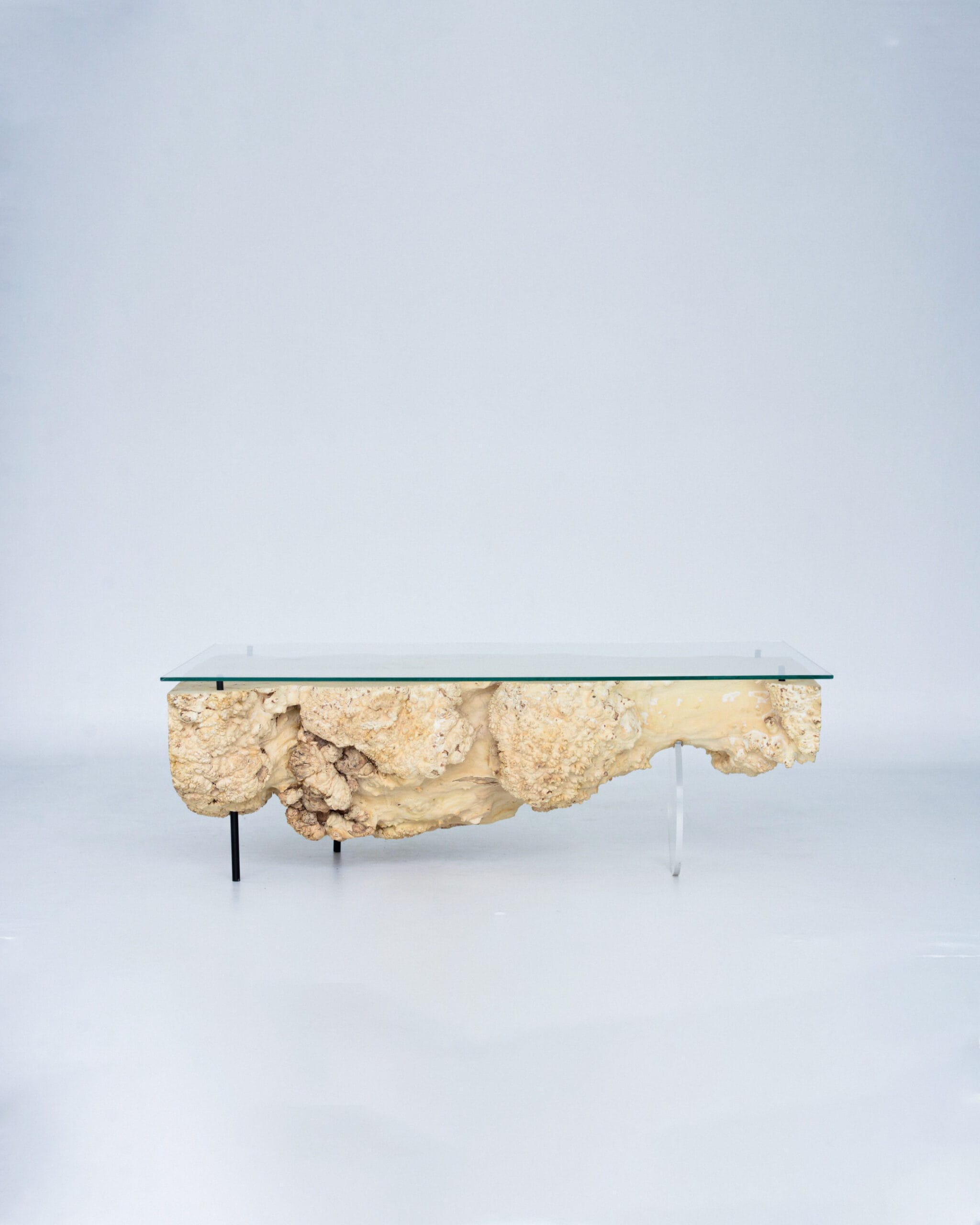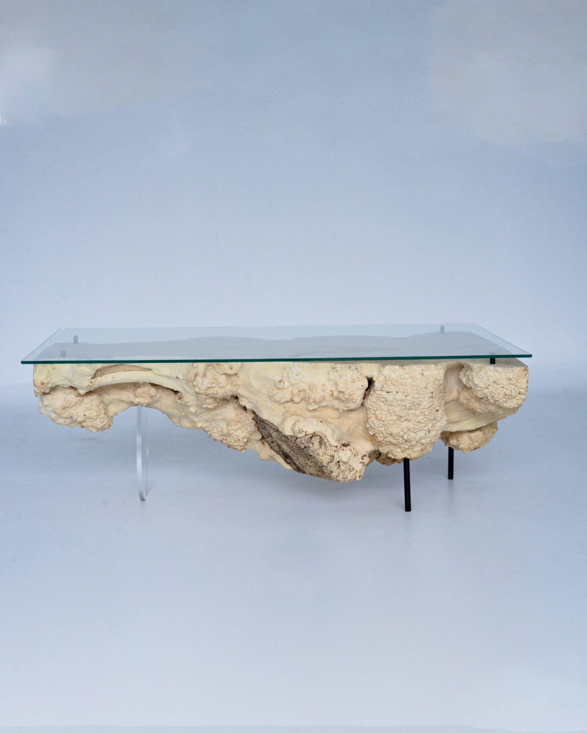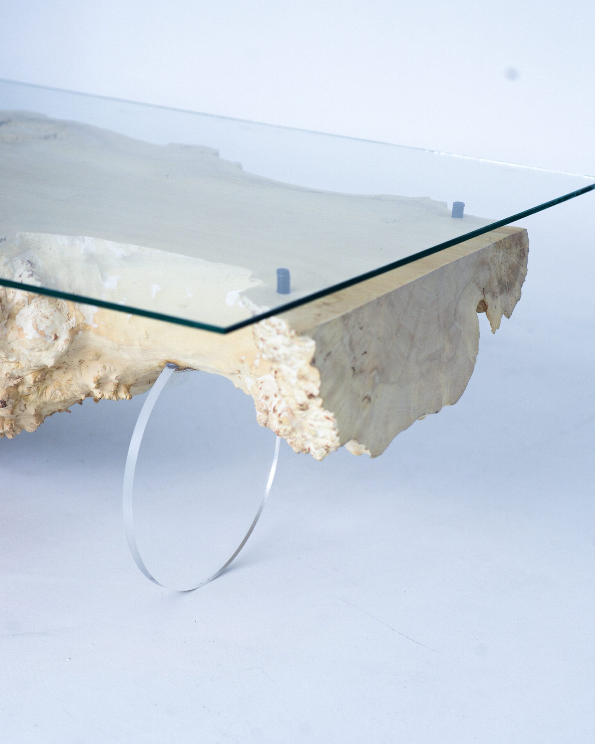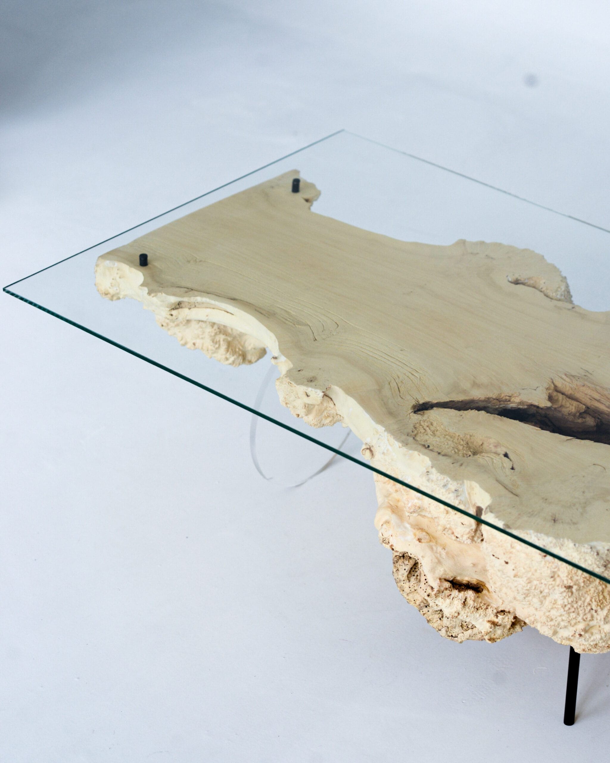 Viršų dengia stiklas, kuris suteikia lengvumo ir leidžia iš viršaus matyti visą medžio faktūrą. Viename gale pritvirtinau apvalią organinio stiklo koją – ji įneša truputį tvarkos ir balanso šiam natūraliam, gyvam paviršiui.